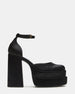 Demand attention when you walk into any room in CHARLIZE black satin heels. A chunky double platform and sky-high block heel define these sandals. sure to give you major disco queen vibes.
